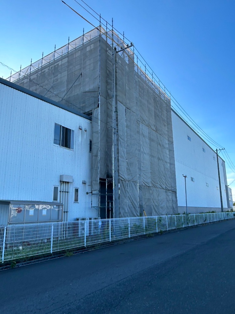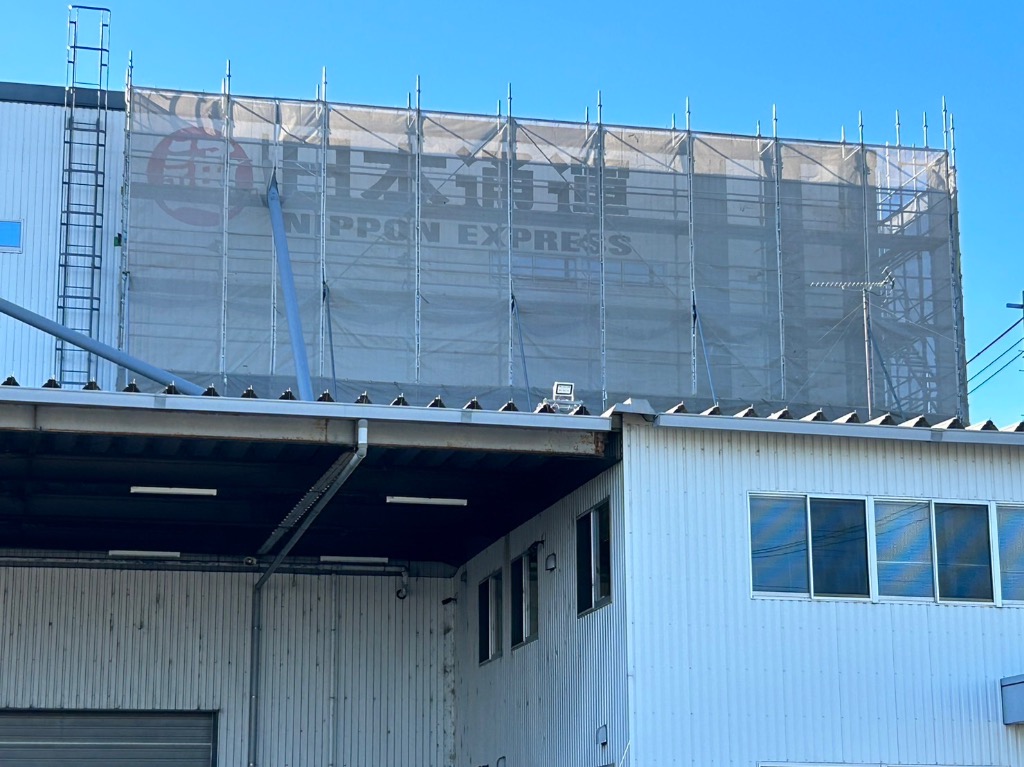 倉庫看板取替の為足場工事の依頼があり、施工させて頂きました。